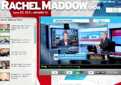 The Rachel Maddow Show is the first program use the Cisco system. It is also the only MSNBC program to be sponsored by Cisco. Cisco display ads and pre-rolls dominate the show's site. We assume that the use of the conference device is part of the sponsorship arrangement.