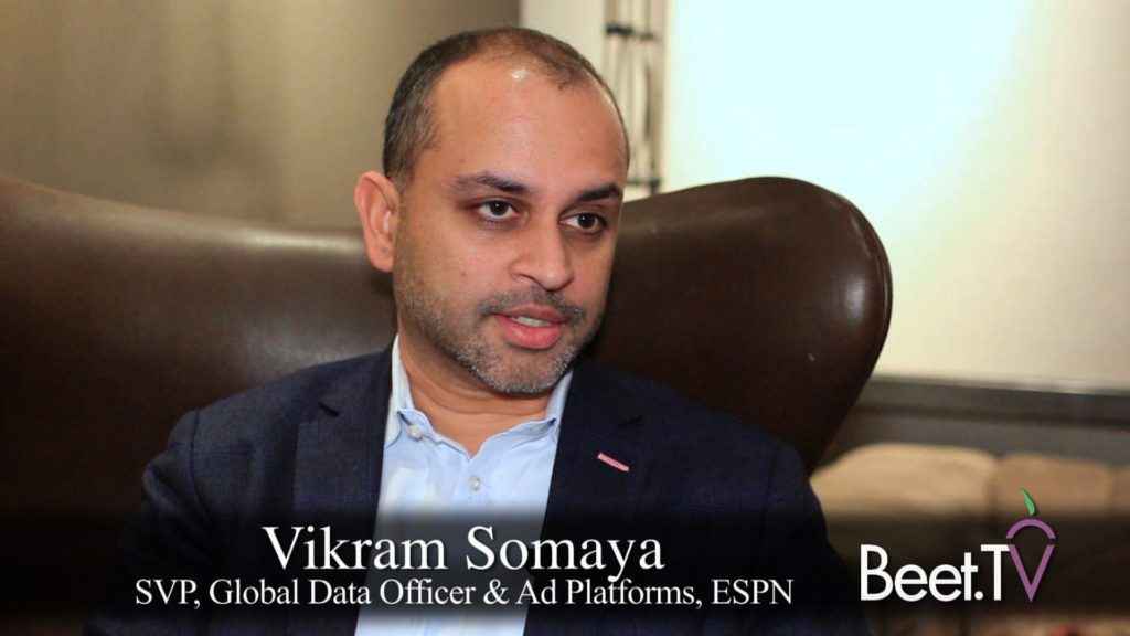 Disney is taking those notions “and broadening them out beyond ESPN” through its other media groups.” So it’s not just about the power of ESPN’s first-party knowledge of sports fans “but more broadly, how do our guests at the Walt Disney Company become part of that audience selling notion,” Somaya adds.