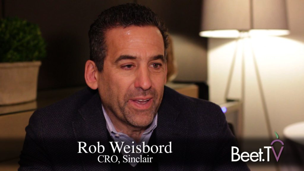 To CRO Rob Weisbord, Sinclair’s future road map will let advertisers extend reach from linear TV to “those cord cutters, cord nevers, cord savers through OTT solutions whether it’s through directly relationships with OTT providers or through an investment we have an in RTB company that is also buying excess inventory on the exchange level.”