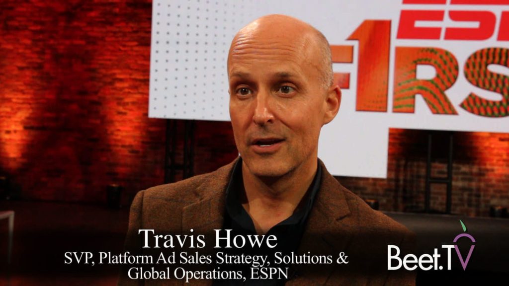 At a Digital Content NewFronts where there was a plethora of new content distribution partnerships, ESPN was the rare standout. “One of the big things that we did announce was the fact that we had a big announcement, that we have no new distribution deals,” says Travis Howe, SVP, Platform Ad Sales Strategy, Solutions & Global Operations.