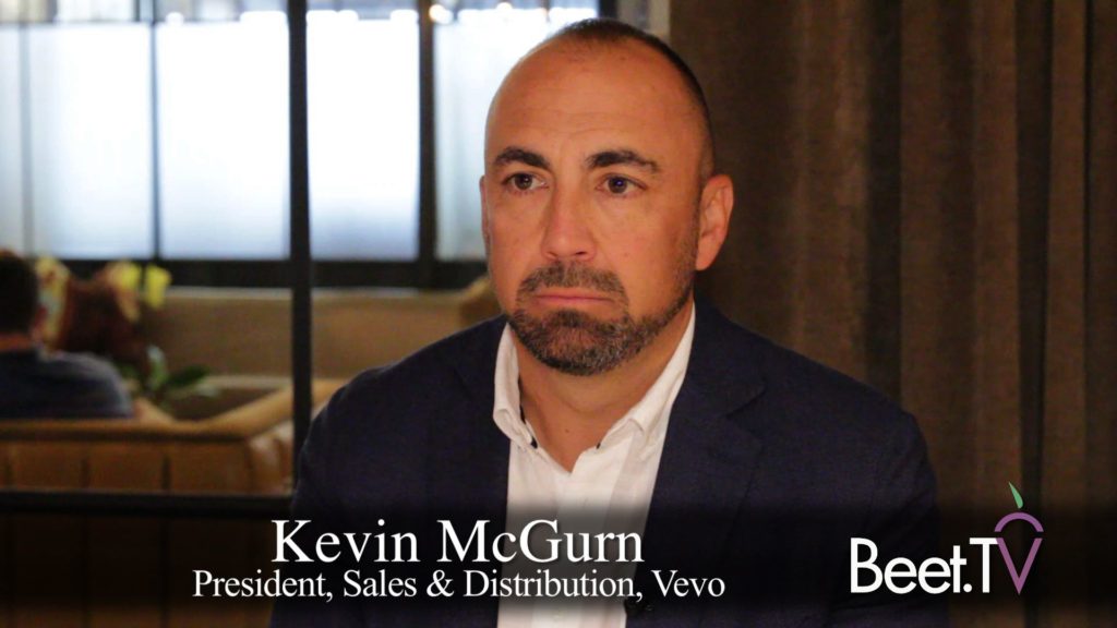 About a year after sunsetting its own apps in favor of distribution via YouTube and virtual MVPD’s, Vevo expects to sell out “a nine-figure body” of music video advertising inventory in the UpFront. It’s part of Vevo’s plan for “returning music television to the living room,” says Kevin McGurn, President of Sales & Distribution.