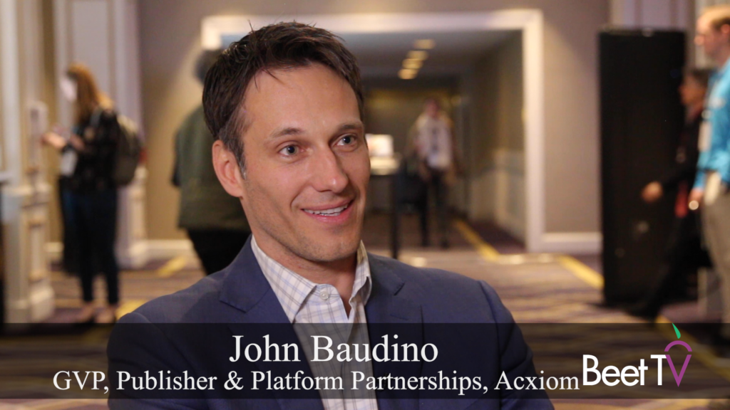 SAN FRANCISCO– Data is more relevant than ever, and clients and partners are becoming more educated about it. Because of this, they’re able to ideate much more effectively. In an interview with Beet.TV’s Jon Watts, John Baudino, gvp of publisher and platform partnerships for Acxiom, explains that as the ecosystem changes, by sticking with the roots of people-based marketing and ethical data sourcing and management, companies can stay ahead of the curve of privacy and legislation.