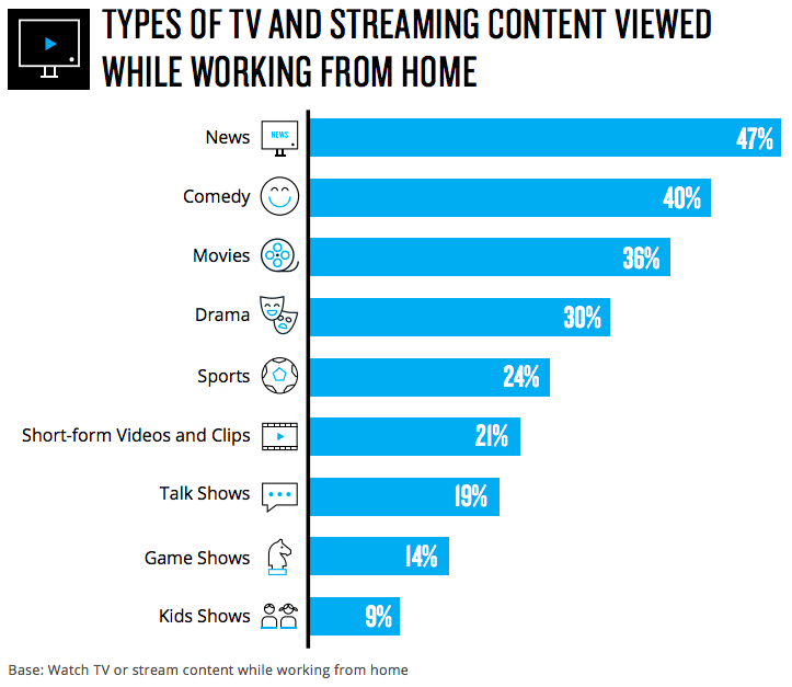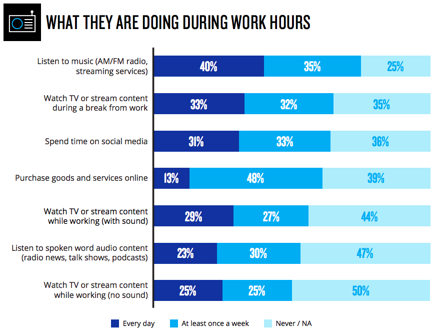 So, what does the new media time look like? The data shows most people listen to music during their work time, but a majority also watches or streams TV during breaks.