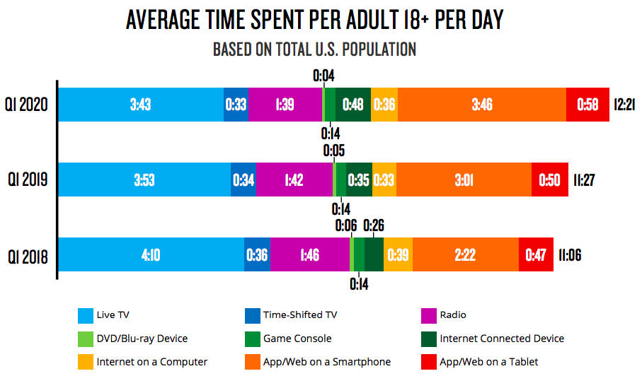 At the macro level, the big story is mobile. Average daily media time is up from 11 hours 27 minutes in Q1 2019 to 12 hours 21 minutes in Q1 2020, which mostly does not factor in the pandemic.
