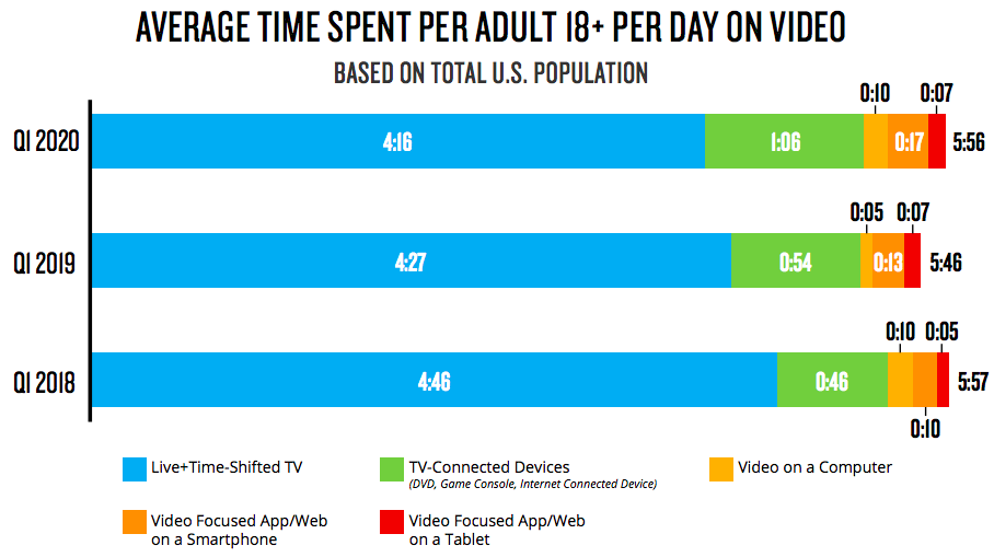 Daily time spent with video is actually down on 2018 levels. Within the average 5 hours and 56 minutes, viewing via connected TVs, computers, smartphones and tablets is displacing that via live and time-shifted TV sets.