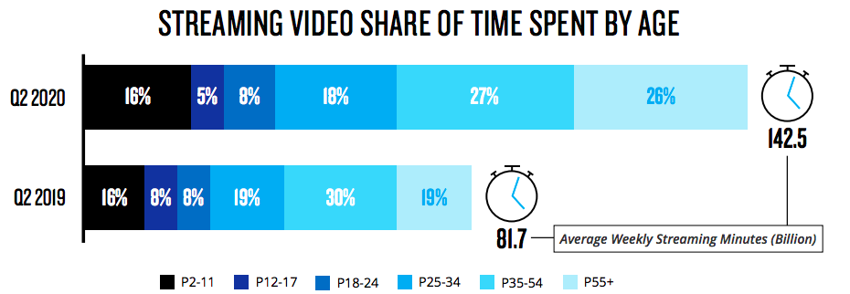 In all, average weekly streaming minutes are up from 81.7 billion in Q2 2019 to 142.5 billion in Q2 2020, representing a 74% increase.