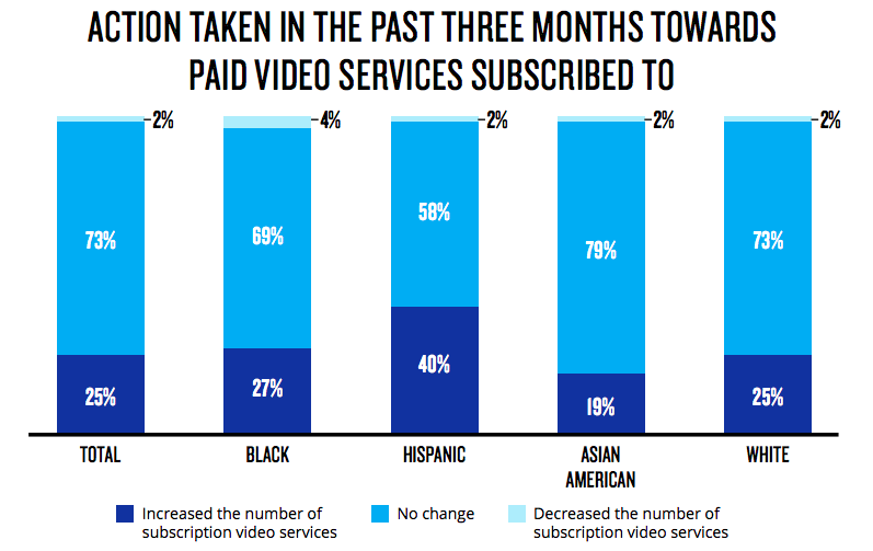 The growing number of streaming services is proving a draw for consumers. Churn out of streaming overall is tiny, at just 2%. Whilst the majority of viewers did not vary their subscription mix, 25% recently added another service, with Hispanics even more likely to have done so.
