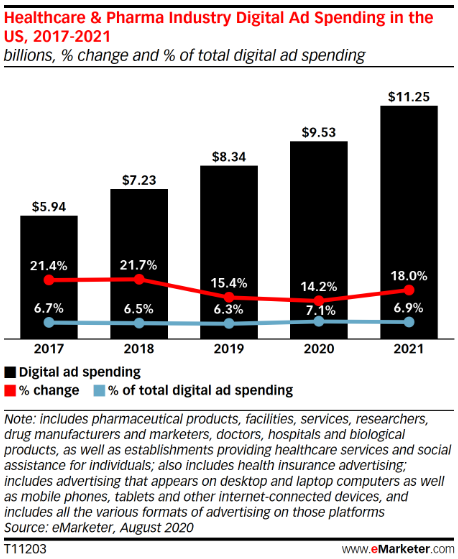 In the U.S., healthcare and pharmaceutical marketers will boost their spending on digital display advertising by almost 16% to more than $4 billion this year, making it the fastest-growing format for the industries, researcher eMarketer estimated.