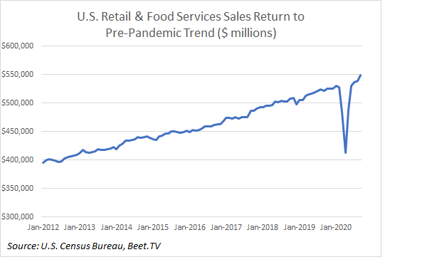 While people are concerned about personal safety, they are still spending money on consumer goods and services. Total retail and food services sales have returned to their pre-pandemic trends, even as consumers cope with disruptions.