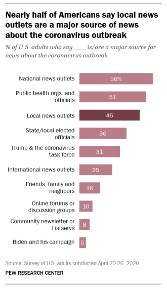 About half (46%) of Americans said local news outlets are a major source of news about the coronavirus, Pew Research Center found in a survey. In addition, 61% of U.S. adults said they were following news about the coronavirus outbreak at both the national and local level equally.