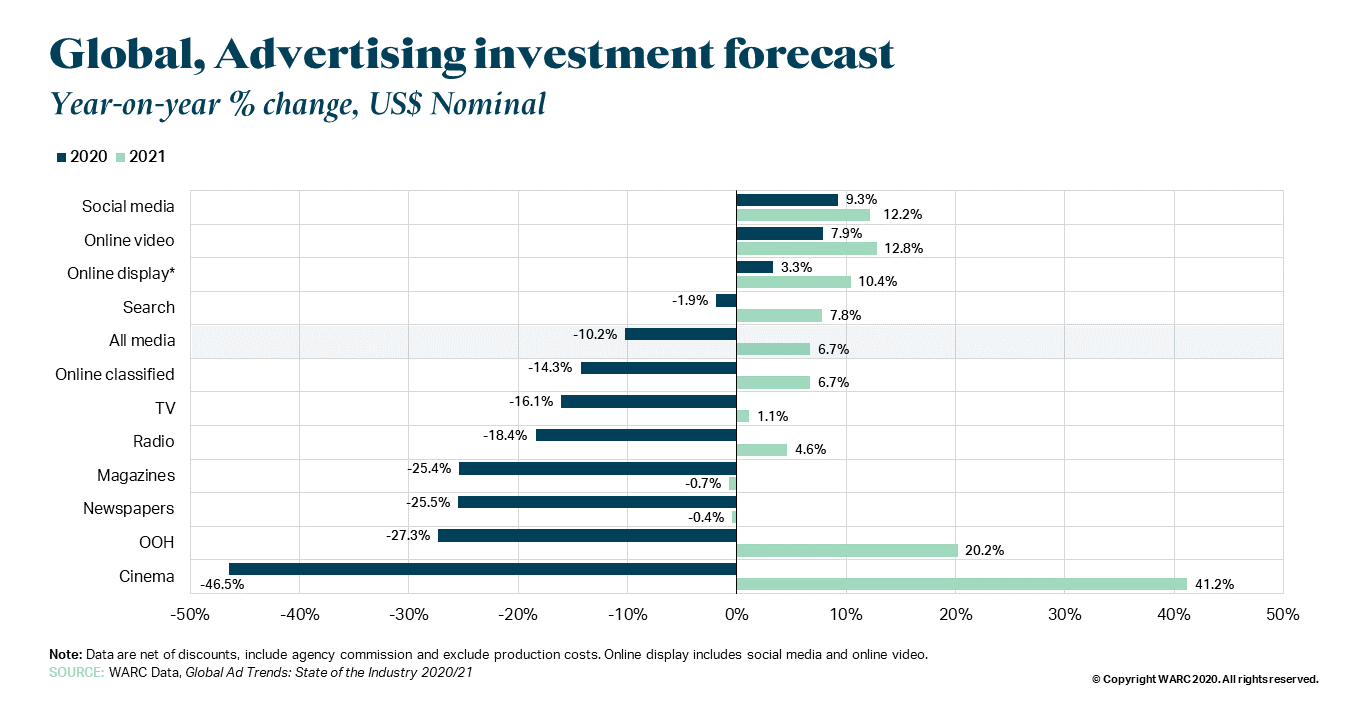 Global media spending will fall by 10% to $557.3 billion this year as the economic fallout of the pandemic weighs on marketing budgets, researcher WARC predicted. Contrasting with that decline, spending online video will grow by 7.9% this year and by almost 13% in 2021 as advertisers seek to reach younger consumers who are spending more time online.