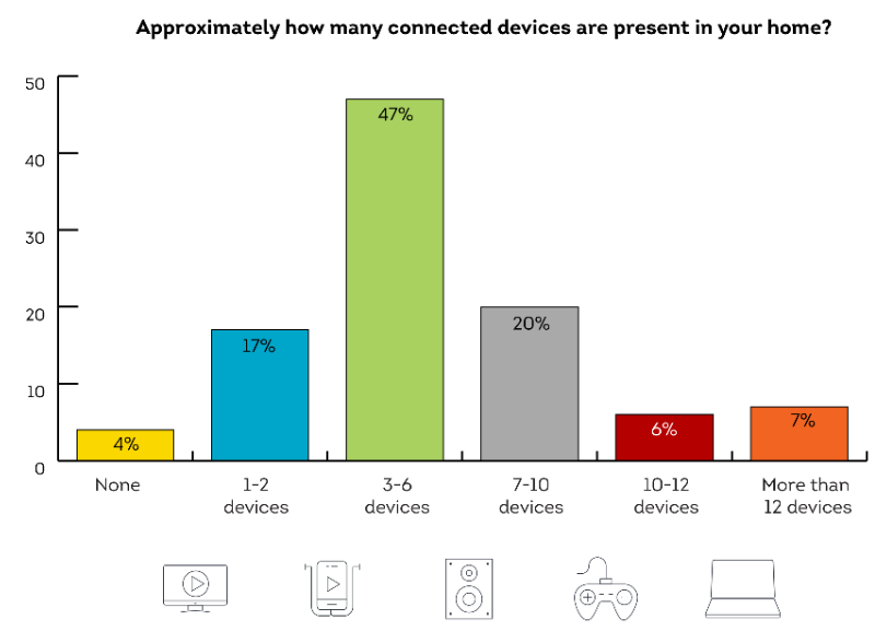 Almost half (47%) of consumers have three to six connected devices in their homes, while 32% have seven or more, TransUnion found in a survey. The popularity of the devices is opening a channel for marketers to target households with data-driven strategies.