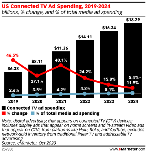 As advertisers seek to reach households that have hooked up their TVs directly to the internet, connected TV ad spending next year will jump 40% to $11.4 billion in the United States, and make up 4.2% of total media spending, researcher eMarketer estimated.