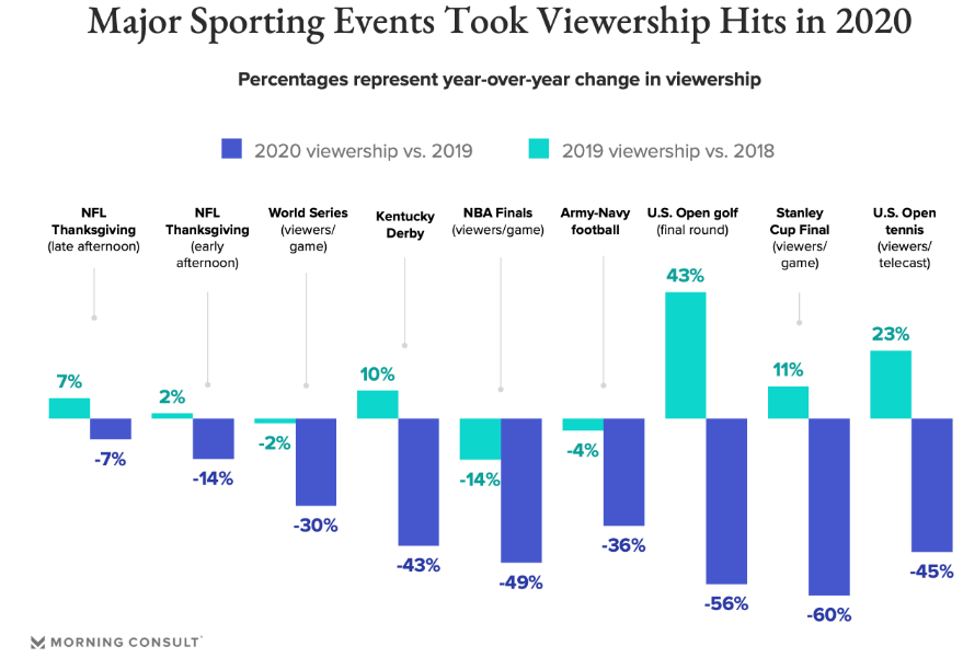 The total cumulative audience of televised was higher than in the past, but sports leagues had to compete more directly for viewers. The National Basketball Association, Major League Baseball, National Hockey League and NASCAR were among the sports organizations to resume operations. Their efforts to complete their seasons later in the fall made them more competitive with the National Football League and college football.
