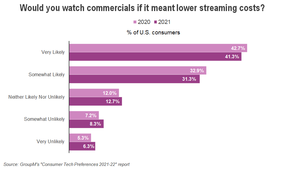 Fewer U.S. consumers than in the past said they will tolerate advertising if it means that can lower their streaming costs, according to GroupM’s tracking survey. The finding indicates that marketers and media outlets need to be mindful of ad loads.
