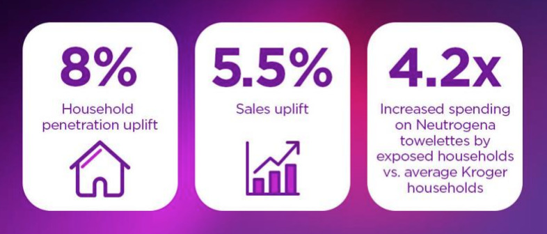 KPM and Roku managed to achieve an 8% household penetration uplift for Johnson & Johnson’s skincare brand Neutrogena when they found Roku users who saw a mid-2021 ad for towelettes spent 4.2x more on the products than average Kroger households.