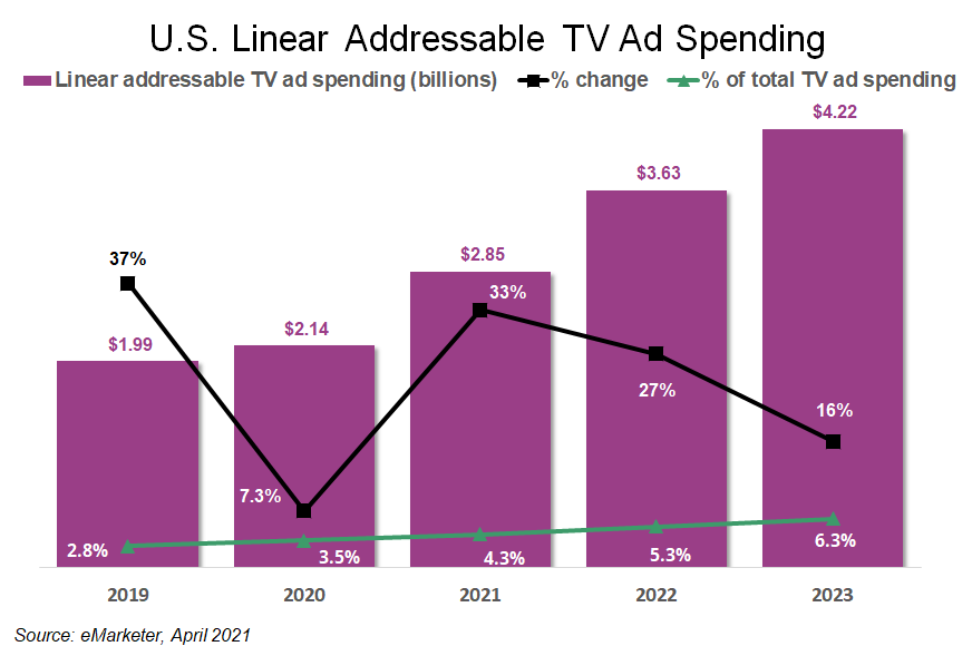 She said some advertisers may resist spending on addressable advertising, especially if they’re selling consumer packaged goods (CPG) that almost everyone needs. Advertisers that seek to reach more targeted groups of consumers, such as automotive brands, makers of luxury goods and travel companies, might see a better return on investment (ROI) from addressable ads.