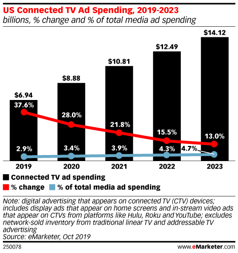 In November, eMarketer estimated that connected ad spending in the US would reach $6.94 billion in 2019, and by 2021 it will total $10.81 billion., with 59.4% of that being traded programmatically.